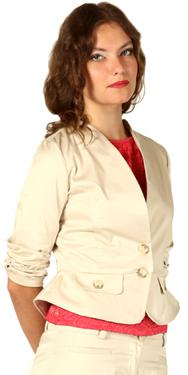 Изящный жакет с БАСКОЙ. Глубокий V-вырез переходит в небольшую стоечку. По линии баски спереди декоративные клапаны с пуговками. Застёжка на 2-е пуговицы. Рукава 3/4 с продольной сборкой и отворотом. Без подкладки.