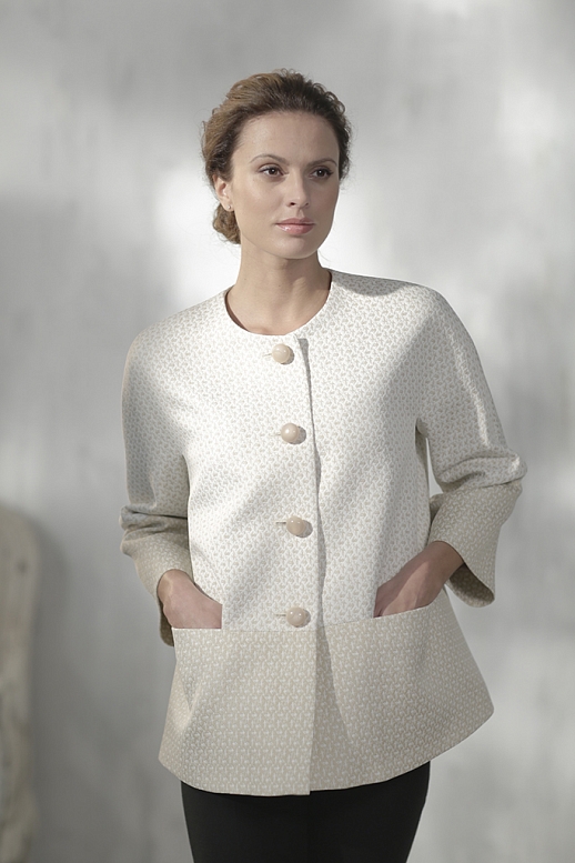 Классическое пальто силуэта трапеция, выполнено из мягкой жаккардовой ткани. Рукава цельновыкроенные с подрезами . Без воротника. Карманы расположены в горизонтальных рельефных швах. По краям деталей проложены отделочные пунктирные строчки.