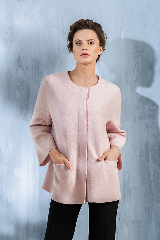 Укороченный жакет из вареной шерсти силуэта трапеция. Без воротника. Застегивается на магнитные кнопки. На полочках горизонтальные подрезы с расположенными в них карманами. Без подкладки.