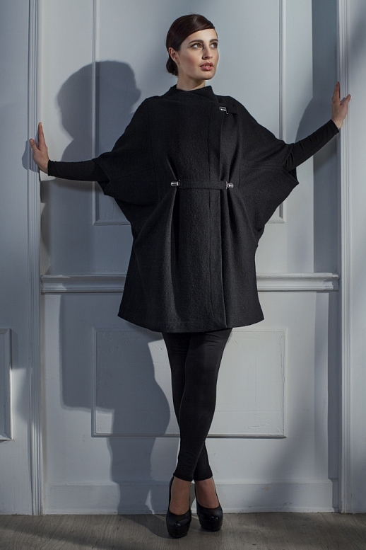 Пальто- жакет бесподкладочное из вареной шерсти . Силуэтные линии этого необычного пальто образованы объемными рукавами, напоминающие по форме усеченные конусы . Застегивается на плече на металлическую клипсу-зажим. Тесьма- застежка на линии талии съемная, с двумя клипсами-зажимами , может быть перемещена в любое место для образования драпировки или нужной степени прилегания.