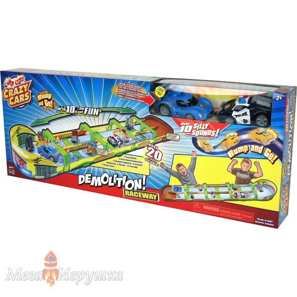 Описание: Трек "Сумасшедшие гонки" в коробке 60*22*70 с прозрачным окном. В набор входят две машинки 8*6*4см, в каждой по 2 батарейки тип ААА. Свет. Звук.,
