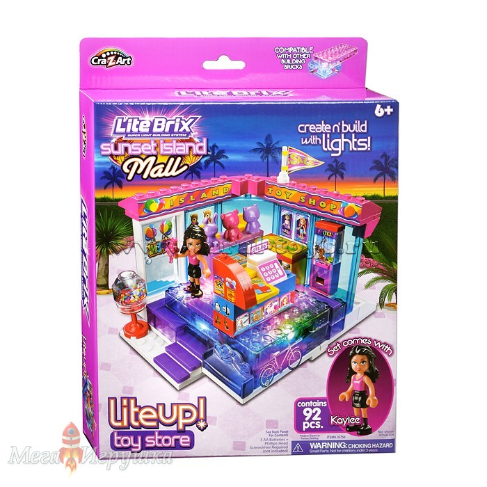 Описание: "Конструктор Магазин на пляже, 77 стандартных деталей, 13 деталей специальной формы, 1 фигурка, 1 светодиодный батарейный блок, 1 лист с наклейками, 1 схема сборки, аксессуары. Конструктор Lite Brix Бутик, 81 стандартный блок, 23 детали специальной формы, 1 фигурка, 1 светодиодный батарейный блок, 1 лист с наклейками, 1 схема сборки, аксессуары. Необходимо 3 х AAA батареи (в комплект не входят).",