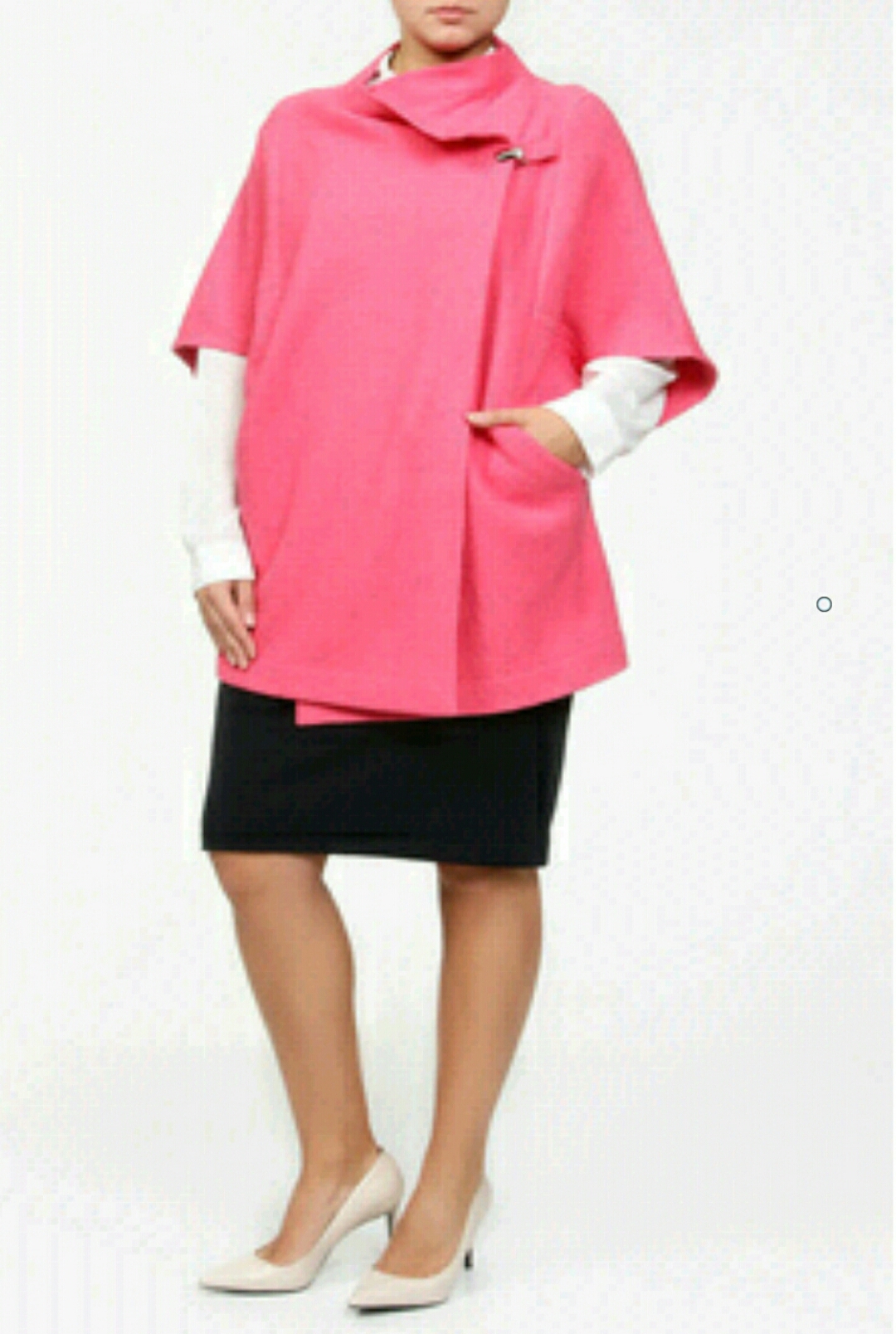 Пальто- жакет бесподкладочное из вареной шерсти . Силуэтные линии этого необычного пальто образованы объемными рукавами, напоминающие по форме усеченные конусы . Застегивается на плече на металлическую клипсу-зажим. Тесьма- застежка на линии талии съемная, с двумя клипсами-зажимами , может быть перемещена в любое место для образования драпировки или нужной степени прилегания.