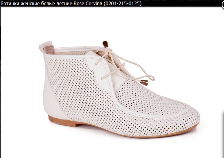 Комфортные летние женские ботинки. Выполнены из перфорированной натуральной кожи белого цвета. Внутри стелька и подкладка из натуральной кожи в пяточной зоне.