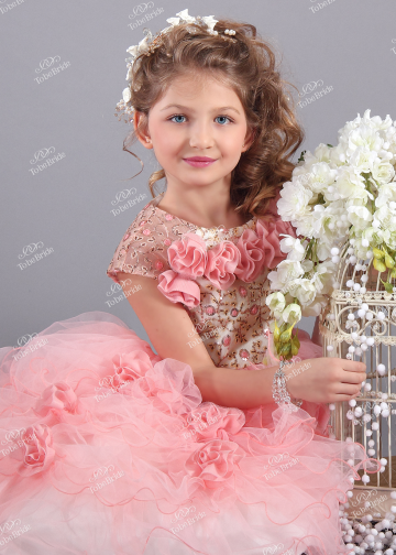 Яркое, праздничное розовое платье-фантазия для таких же ярких девочек. Верх платья выполнен из еврофатина, расшитого пайетками и шелковой нитью и задрапирован розовыми цветами более яркого оттенка. Цветы в симметричном порядке переходят на юбку с воланами из шести слоев еврофатина. Хлопчатобумажный подклад платья заботится о комфорте детской кожи. Застежка на молнии.