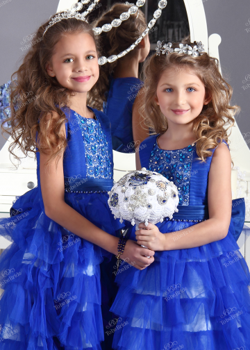Бело-синее платье-сказка. Модель сочетает в себе столько идей и задумок, что его можно сравнить с увлекательной сказкой. Хлопчатобумажный подклад платья заботится о комфорте детской кожи. Верх платья оригинально задрапирован фатином и закрыт сеткой-кружевом, расшитым шелковой нитью и стразами. Поясок слегка более темного оттенка расшит искусственным жемчугом. Воланы юбки выполнены из белого атласа и шести слоев еврофатина. Благодаря этому решению юбка с жесткой сеткой как будто напоминает веселый фонтанчик или ручеек. Для барышень с неистощимой фантазией. Застежка-молния.