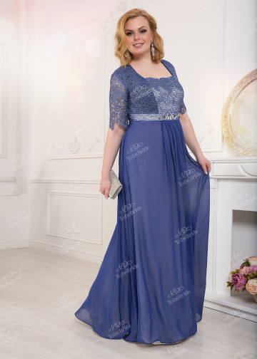 Нарядное платье нежно-сиреневого оттенка. Верх платья выполнен из кружева с аппликацией из камней. Пояс обтянут гипюром. Рукава платья также кружевные и прозрачные. Юбка выполнена из шифона, что придает образу воздушность и легкость. Идеальное платье для торжественного ужина и выхода в свет.