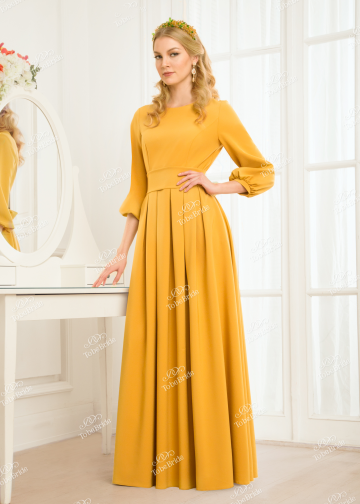 Кода хочется весны и солнечного настроения, наденьте это платье! Струящаяся юбка в пол, обрамленная широким поясом-кушаком, делает Ваш образ трепетно-женственным. Благородный горчичный цвет платья красиво оттеняет цвет Ваших глаз и волос. На какое бы мероприятие Вы ни пошли, Вы будете в центре внимания!