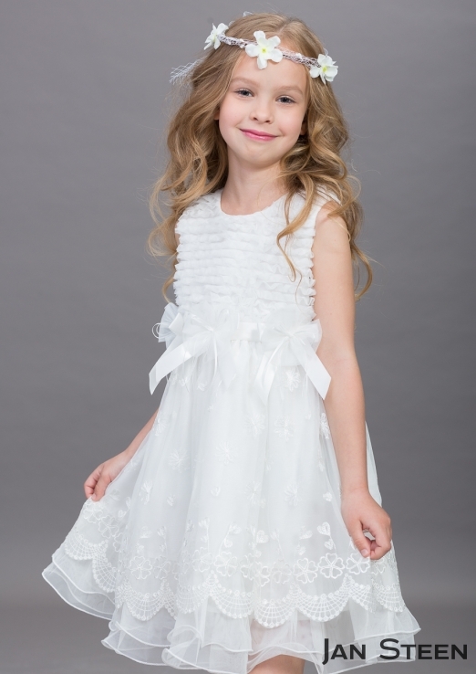 Платье станет отличным нарядом для торжественных мероприятий. Лиф платья декорирован рюшами из жатого фатина, имеет круглый вырез горловины и короткие рукава. Талию подчеркивает атласный пояс, который сзади завязывается в изящный бант. Пышная юбка из нежного кружева. Подкладка платья выполнена из хлопковой ткани. На спинке застежка-молния.