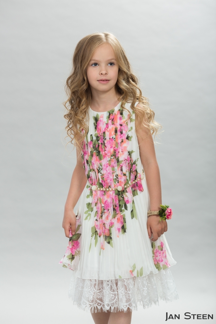 Элегантное платье с классическим лифом и стильным плиссе, без рукавов для девочек, сделанное из струящегося шифона. Классический круглый вырез с обеих сторон. Юбка дополнена многослойной отделкой из кружева и мягкой евросетки на хлопковом подкладе. Изысканный цветочный принт, в сочетании с плиссеровкой, придают ему очень элегантный вид. Платье застегивается на молнию сзади, а экстровагантный пояс в виде цепочки с декоративными жемчужинами застегивается карабином и позволяя регулировать любой размер.