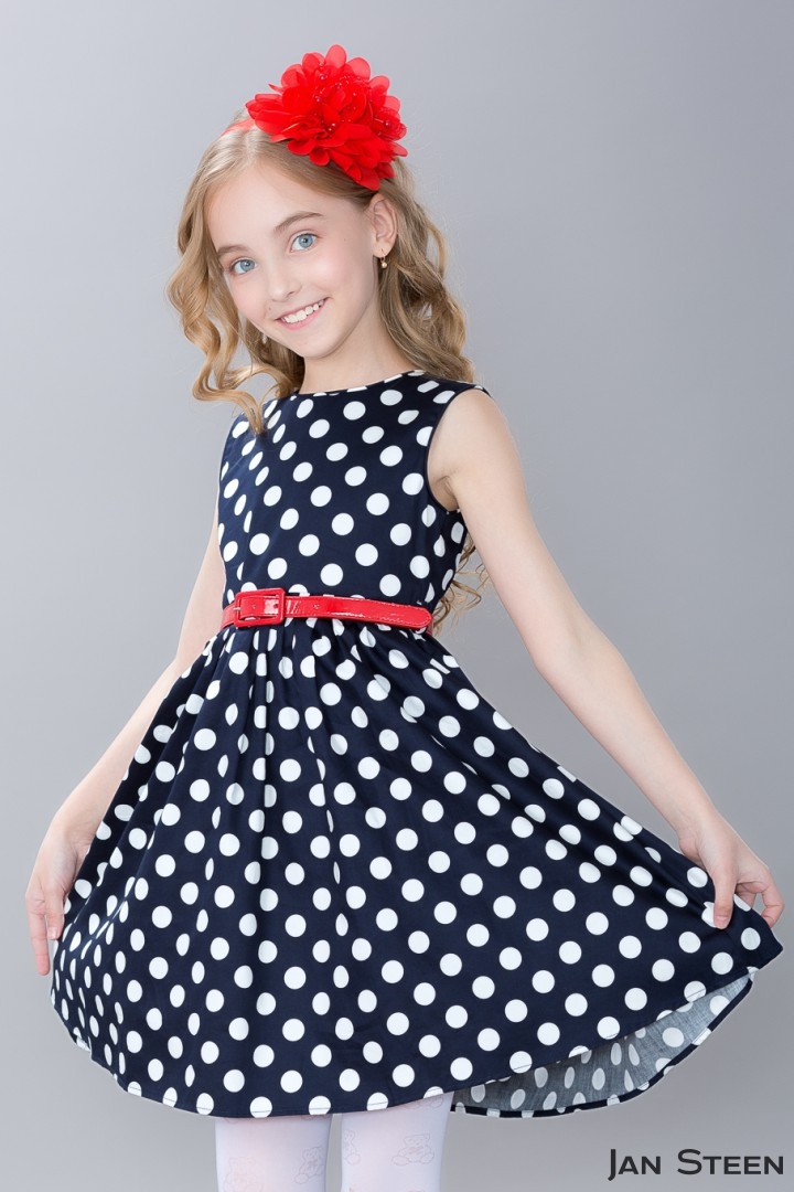 Модное платье для девочек Baby Steen темно-синего цвета с всегда модным, рисунком в горох. Широкая юбка скроена в виде полу-солнца, талию подчеркивает контрастный пояс красного цвета из эко - кожи. В комплекте с платьем идет ободок ручной работы. По спинке потайная застежка молния. Очень игривое платье, которое всегда в тренде.