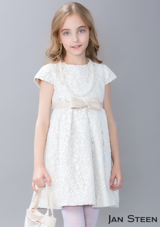 Платье цвета айвори из плотного кружева с цветочным орнаментом. Лиф прилегающий, с короткими рукавами, круглым вырезом горловины, застежкой-молнией на спинке. Линию талии подчеркивает пояс, впереди декорированный бантиком и подвеской, а сзади завязывающийся в бант, регулируя объем. Подкладка выполнена из хлопковой ткани. Юбка платья по линии талии присборена в мягкие складки. В комплекте к платью - сумочка, декорированная бантом.