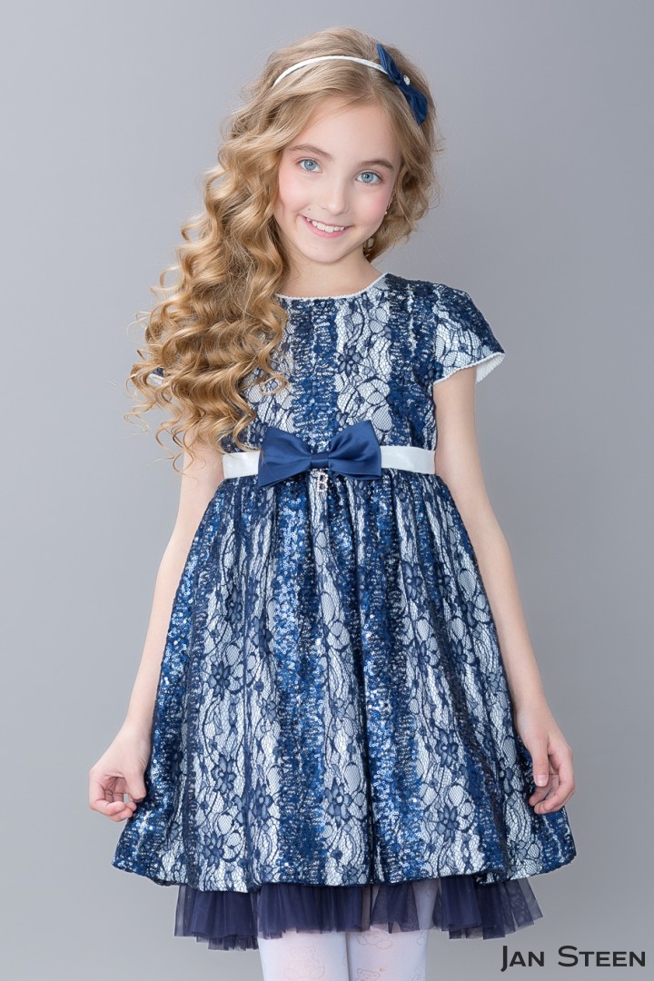 Нарядное детское платье Baby Steen из нежного, ажурного гипюра с пайеткой в виде вертикальных полос. Модель имеет слегка завышенную талию, которую подчеркивает пояс, из хлопкового сатина сзади завязывающийся на бант, что позволяет регулировать ширину. По горловине и рукавчику платье отделано жемчужной лентой. Спереди платье украшено бантиком и подвеской из-страз. Застежка - потайная молния. К нижней пышной юбке пришита оборка из евро-сетки. В комплекте с платьем идет ободок ручной работы с бантиком.