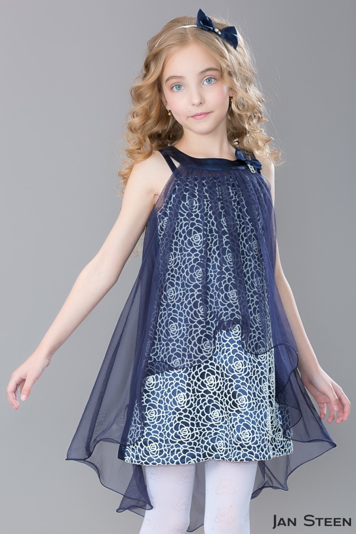Нарядное платье-туника Baby Steen для маленьких модниц. Эта модель прямого силуэта из атласа спереди задекорированна кружевом. Романтики и шарма платью добавляет воздушная накидка из легкой сетки. с украшением. Сзади платье застегивается на потайную молнию. В комплекте идет ободок с атласным бантиком декорированный стразами ручной работы.
