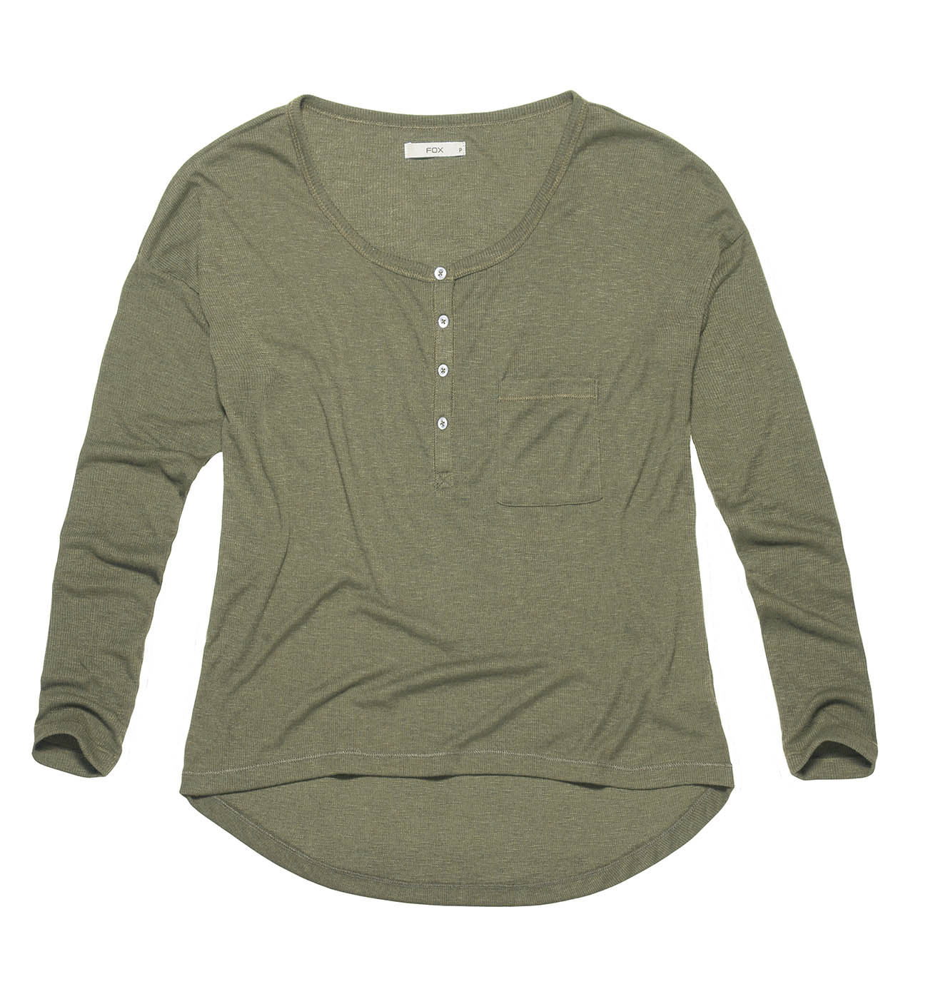 Блуза выполнена из тонкого трикотажного материала. Спереди небольшой карман и застежка на пуговицах.