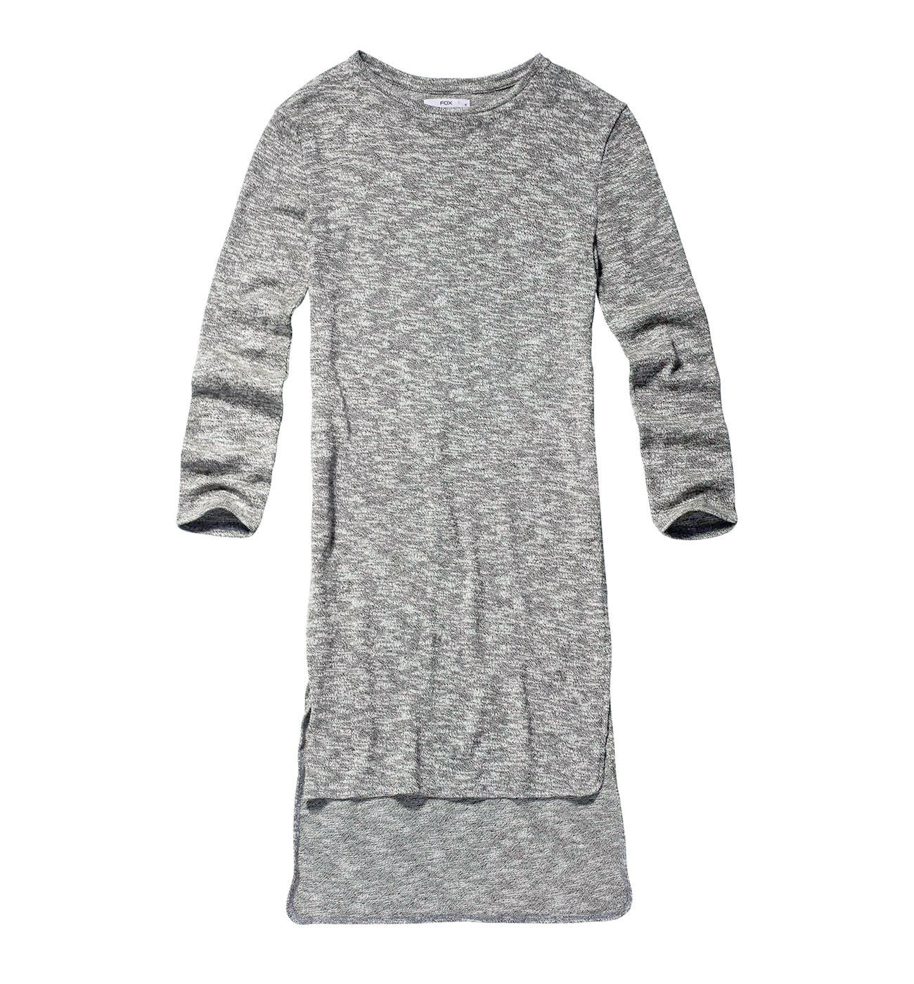 Платье свободного покроя. Длинный рукав без манжетов, небольшой округлый вырез. Модель с ассиметричной линией низа - передняя часть изделия короче задней, по бокам разрезы.