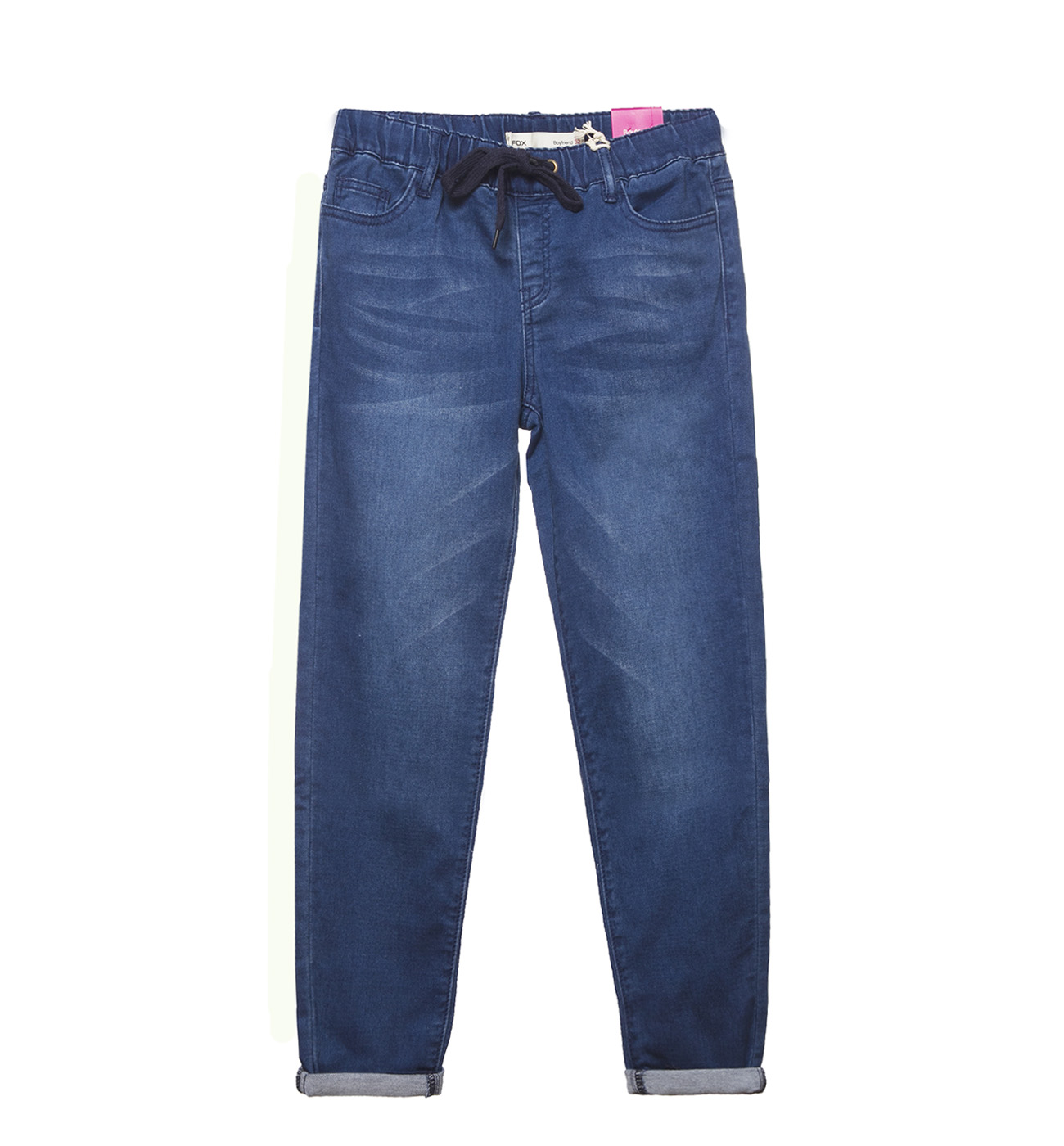 Джинсы женские. Модель выполнена из хлопковой ткани. Детали: посадка средняя; пояс на резинке и кулиске со шнурком; пять карманов; шлевки.