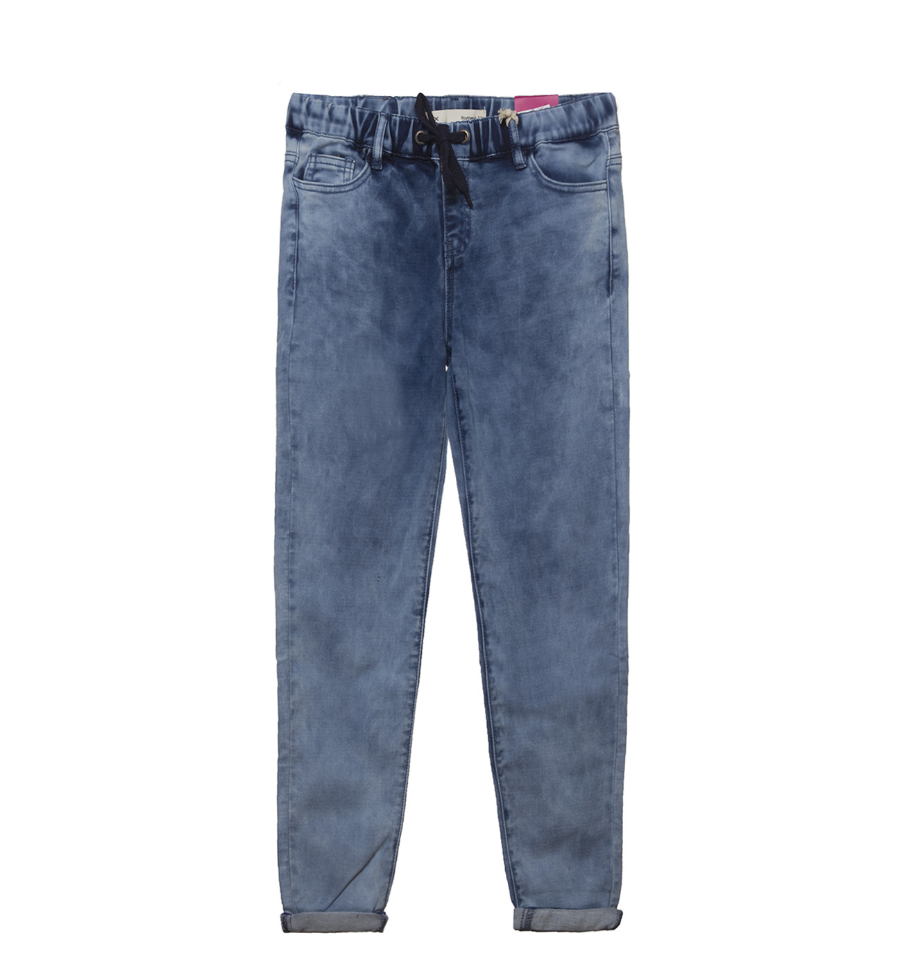 Джинсы женские. Модель выполнена из хлопковой ткани. Детали: посадка средняя; пояс на резинке и кулиске со шнурком; пять карманов; шлевки.