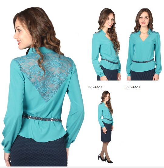 РОМАНТИЧНОЕ КРУЖЕВО! Блуза с неглубоким V-вырезом и маленькой стоечкой. Шикарная глубокая кружевная кокетка на спинке украшает и плечи. Рукав среднего объёма заканчивается складками и манжетом. Линия низа закруглена. Прилегание среднее.