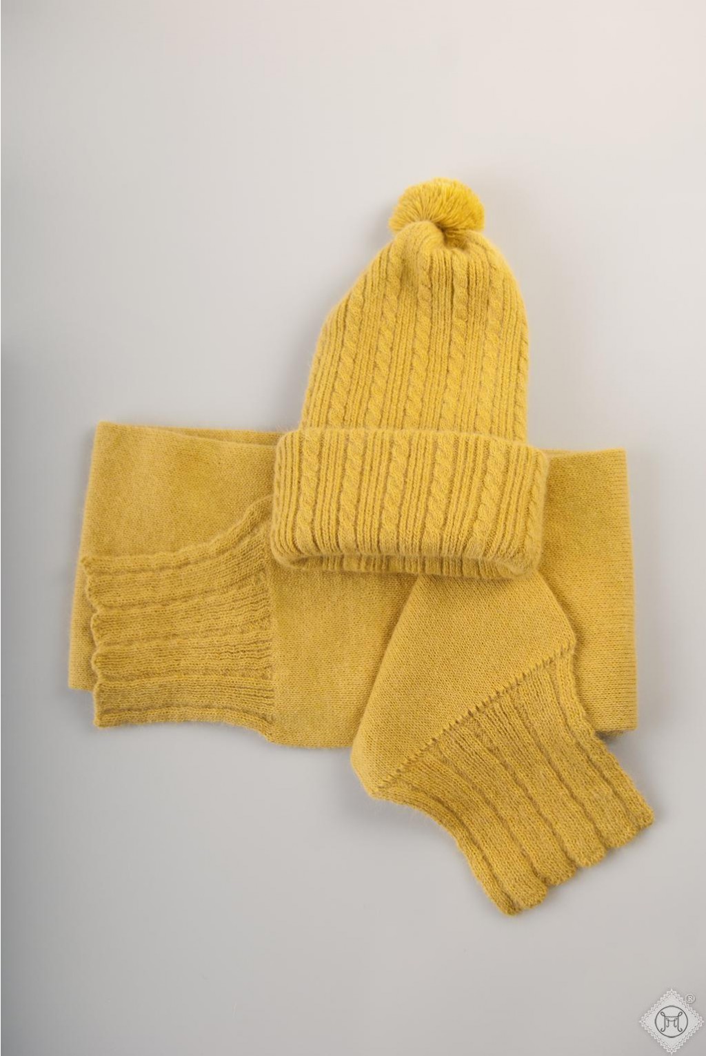 Состав: шапка: ангора - 46%, ПА - 37%, шерсть - 9%, эластан - 8%; шарф: ангора - 50%, ПА - 40%, шерсть - 10%