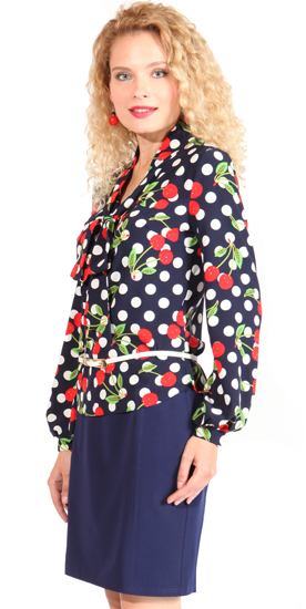 БАНТ + ВИШЕНКИ с горошком МОДНЫЙ ПИСК!! Блуза с V-вырезом и воротником - бантом, который можно завязать и как галстук. Объёмный рукав внизу перехвачен манжетом. Линия низа закруглена. Облегание свободное. Можно носить как с пояском, так и без.