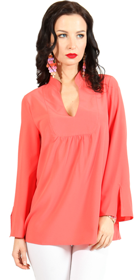 КОЛЛЕКЦИЯ "ПРИВЕТ 70-м!" Хиппи-туника А-силуэта с мини воротничком-стойкой. Свободные рукава с разрезом внизу. Можно носить свободно и под пояс. Модно этим летом с узкими брючками.