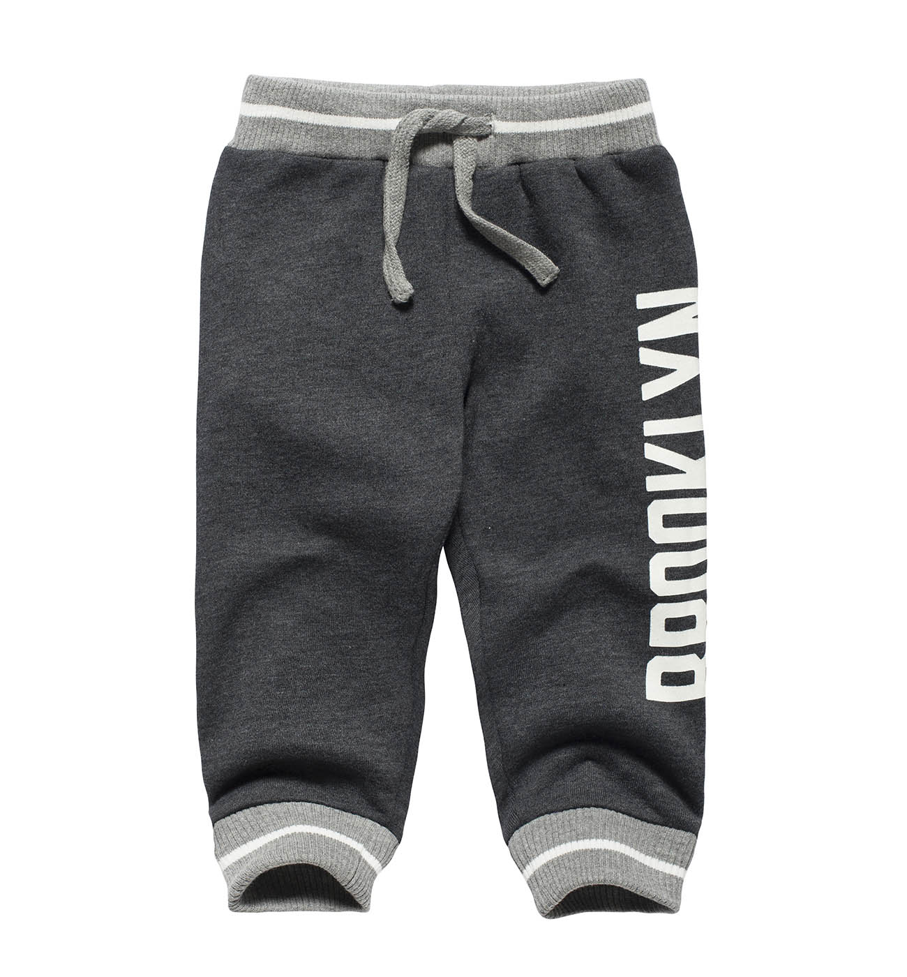 Брюки спортивные для мальчиков. Модель выполнена из мягкого футера. Детали: пояс на резинке и кулиске со шнурком; манжеты на резинке. На левой штанине принт.