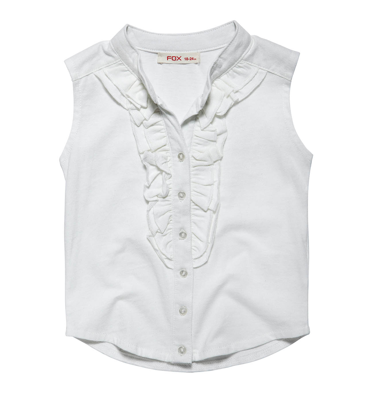 Блузка для девочек. Стиль- повседневный. Модель выполнена из легкого хлопка. Без рукавов. Застежка- пуговицы. Детали: передняя часть модели украшена жабо.