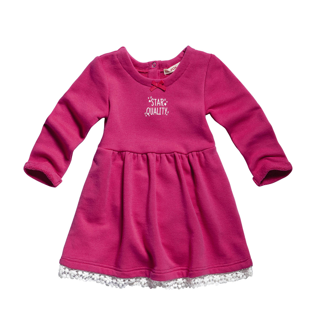 Платье для девочек. Модель выполнена из материала . Рукав- длинный. На спине застежка на кнопки. Детали: круглый вырез; на горловине маленький бантик, принт на груди, подол платье отделан кружевом.