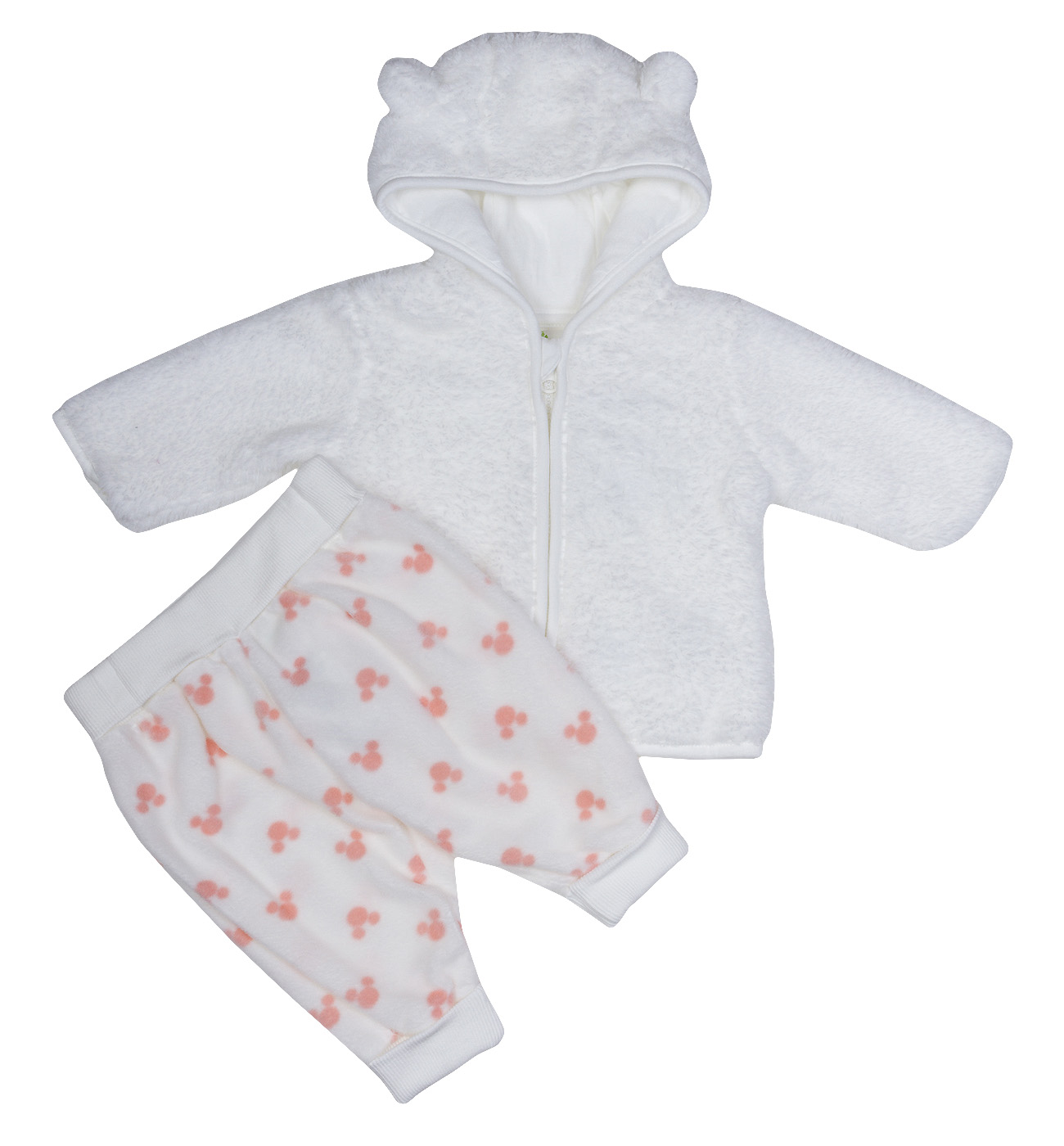 Костюм для новорожденных. Толстовка выполнена из пушистого флиса. Детали: рукав- длинный; застежка на молнию; капюшон с декоративными ушками. Брюки изготовлены из мягкого флиса. Детали: эластичная резинка в поясе и манжетах; принт.