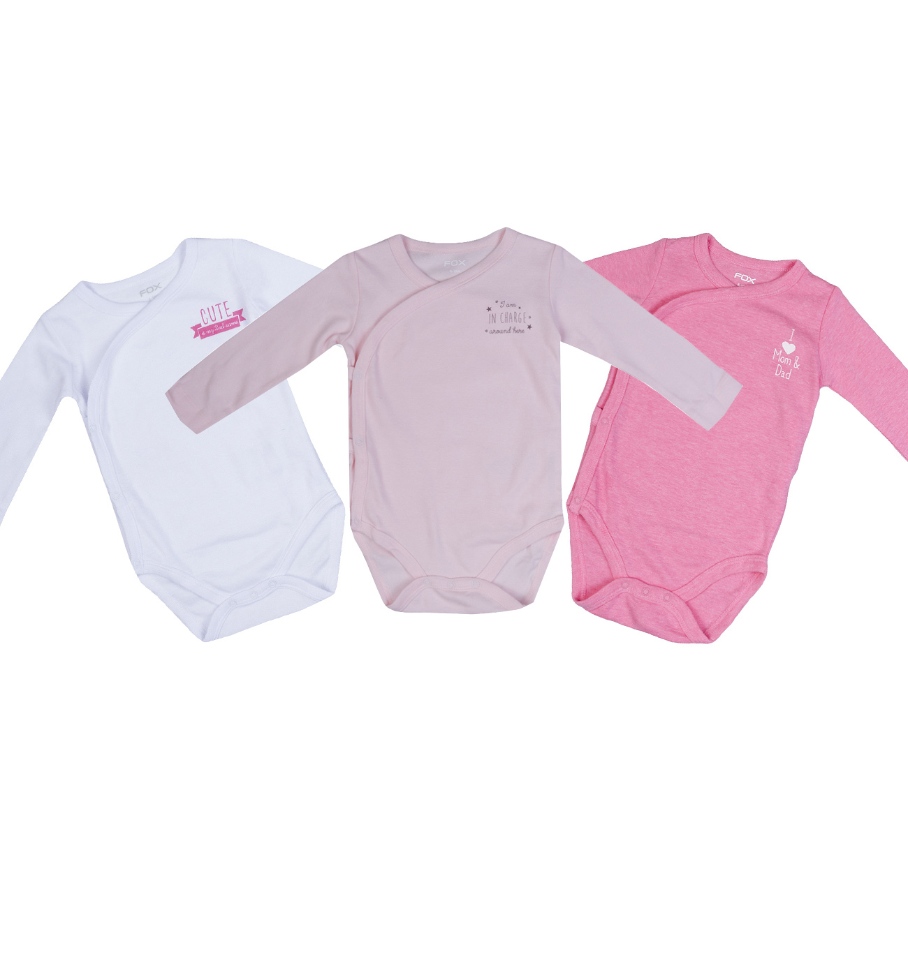 Боди для девочек. Рукав длинный. Модель выполнена из мягкого хлопка. Детали: спереди справа надпись, с левой стороны и на ластовице застежка на кнопки. В комплект входит три модели в разных цветах.