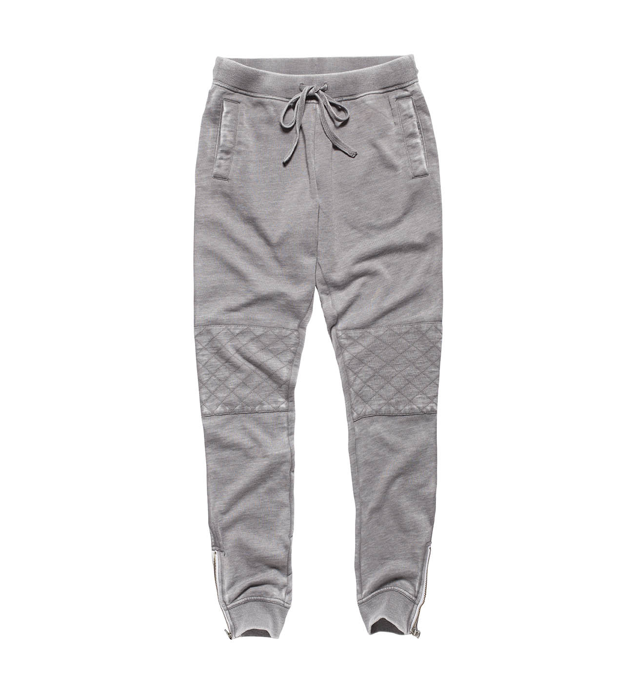 Брюки спортивные женские. Модель выполнена из петельчатого футера. Детали: пояс на резинке и кулиске со шнурком; два кармана; по бокам штанин молнии; на коленях декоративные вставки из стеганного материала; манжеты на трикотажной резинке.