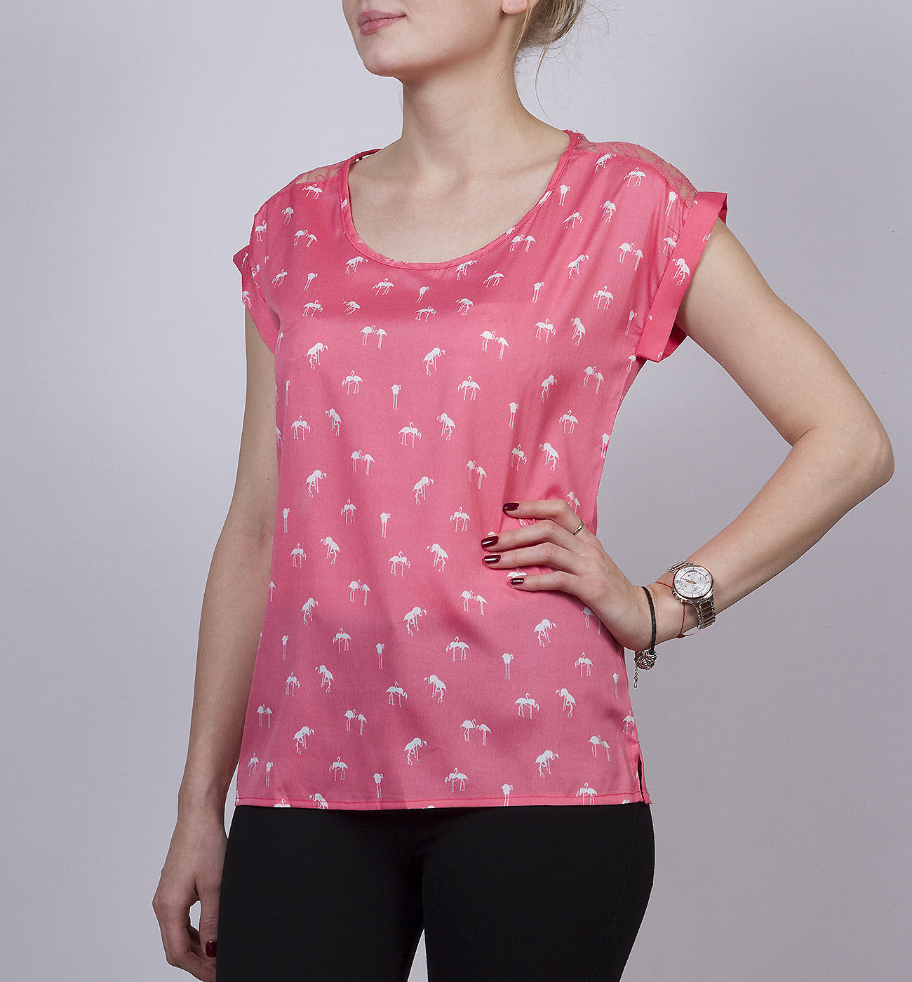 Футболка женская. Модель выполнена из легкой ткани. Детали: круглый вырез; короткий рукав с подворотом; принт; на плечах декор кружевом.