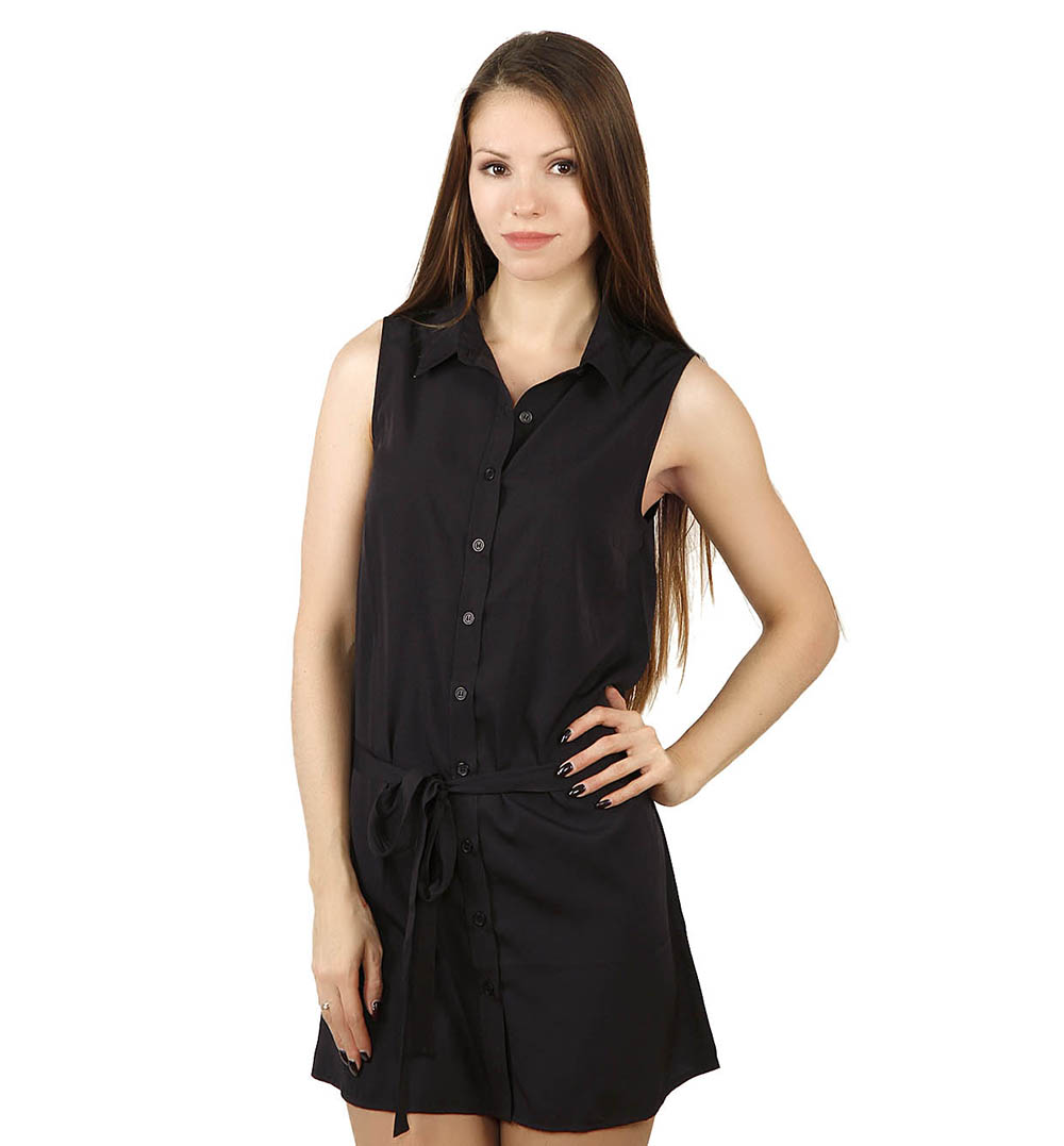 Платье женское. Модель выполнена из легкой ткани. Детали: длина-мини; отложной воротник; застежка на пуговицы; тонкий съемный пояс; приталенный силуэт.