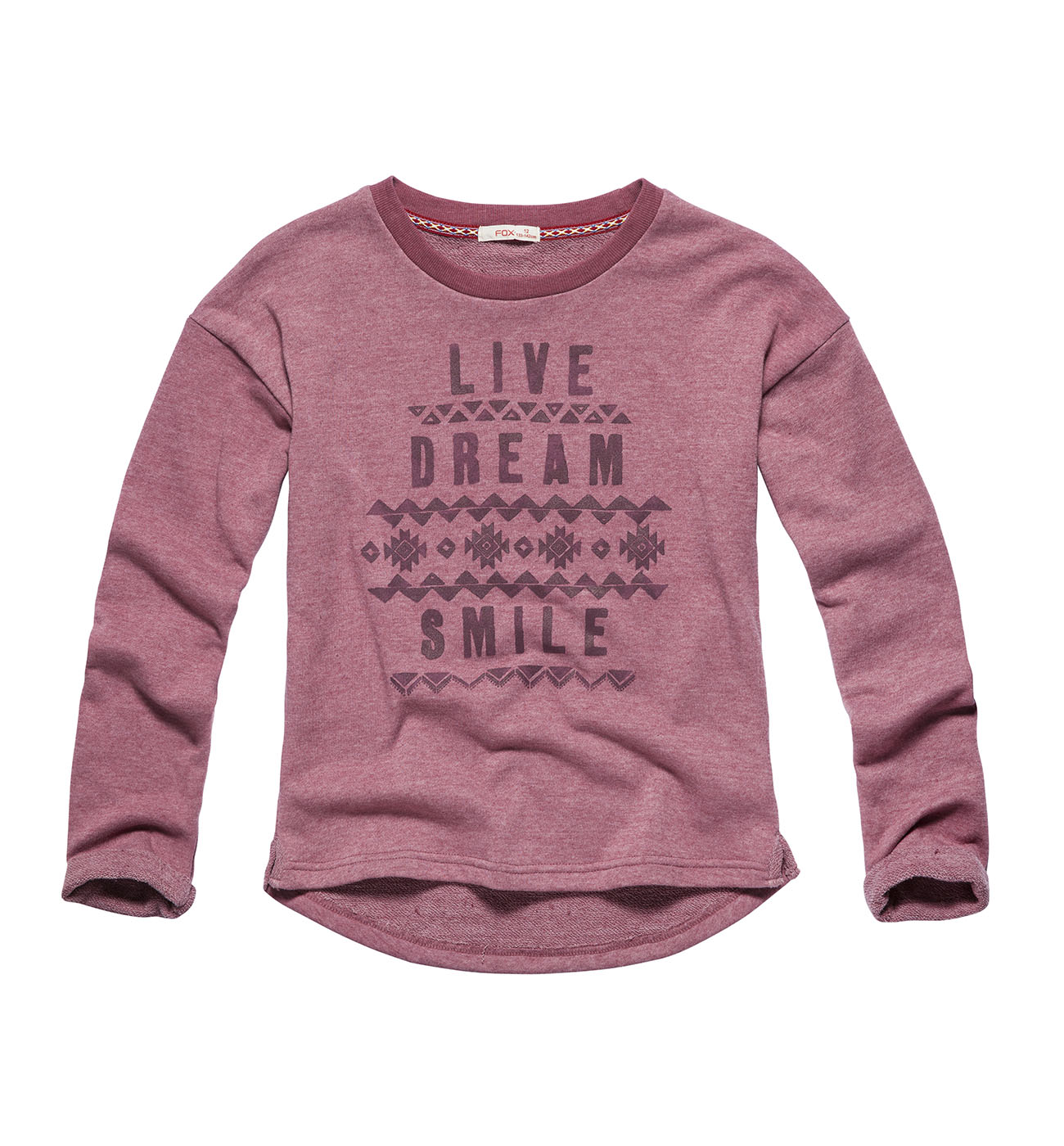 Толстовка для девочек. Модель выполнена из петельчатого футера. Детали: круглый вырез; длинный рукав; принт; небольшие разрезы по бокам; отвороты на манжетах.