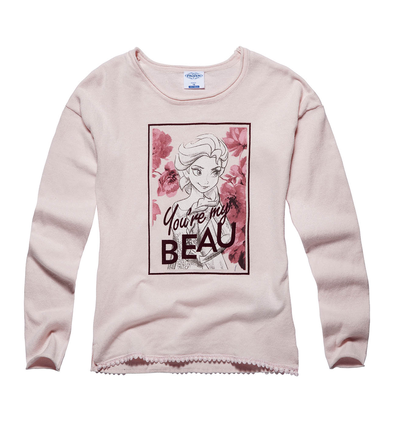Джемпер для девочек. Модель выполнена из вязаного трикотажного полотна (гладкая вязка). Детали: круглый вырез; по бокам небольшие разрезы; принт; по нижней части джемпера декор; спущенное плечо.