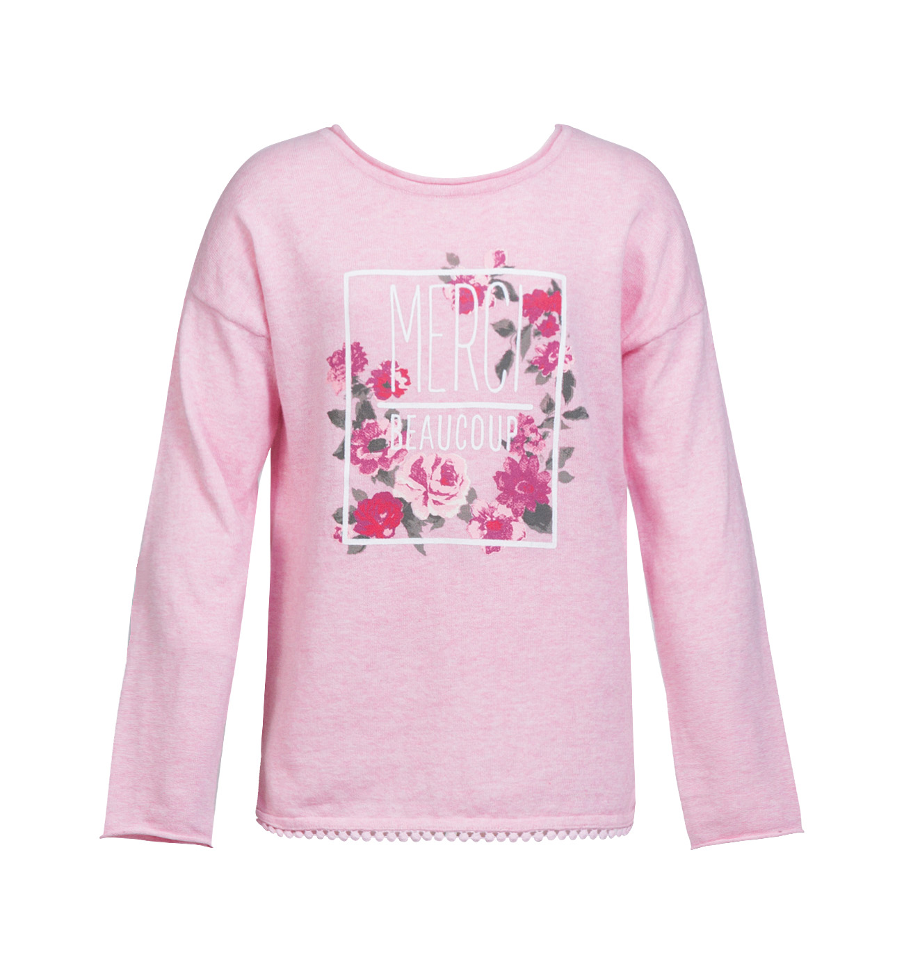 Джемпер для девочек. Модель выполнена из вязаного трикотажного полотна (гладкая вязка). Детали: круглый вырез; по бокам небольшие разрезы; принт; по нижней части джемпера декор; спущенное плечо.