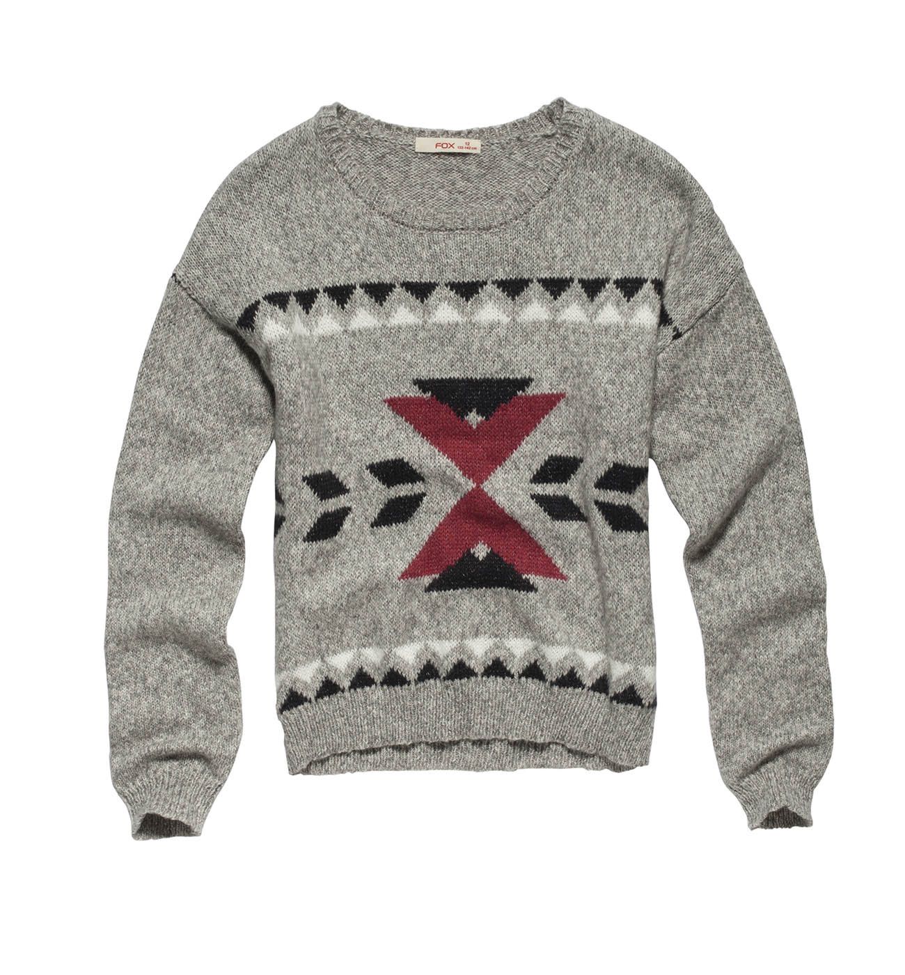 Джемпер вязаный для девочек. Детали: круглый вырез; длинный рукав; манжеты, горловина и низ джемпера связаны резинкой; орнамент.