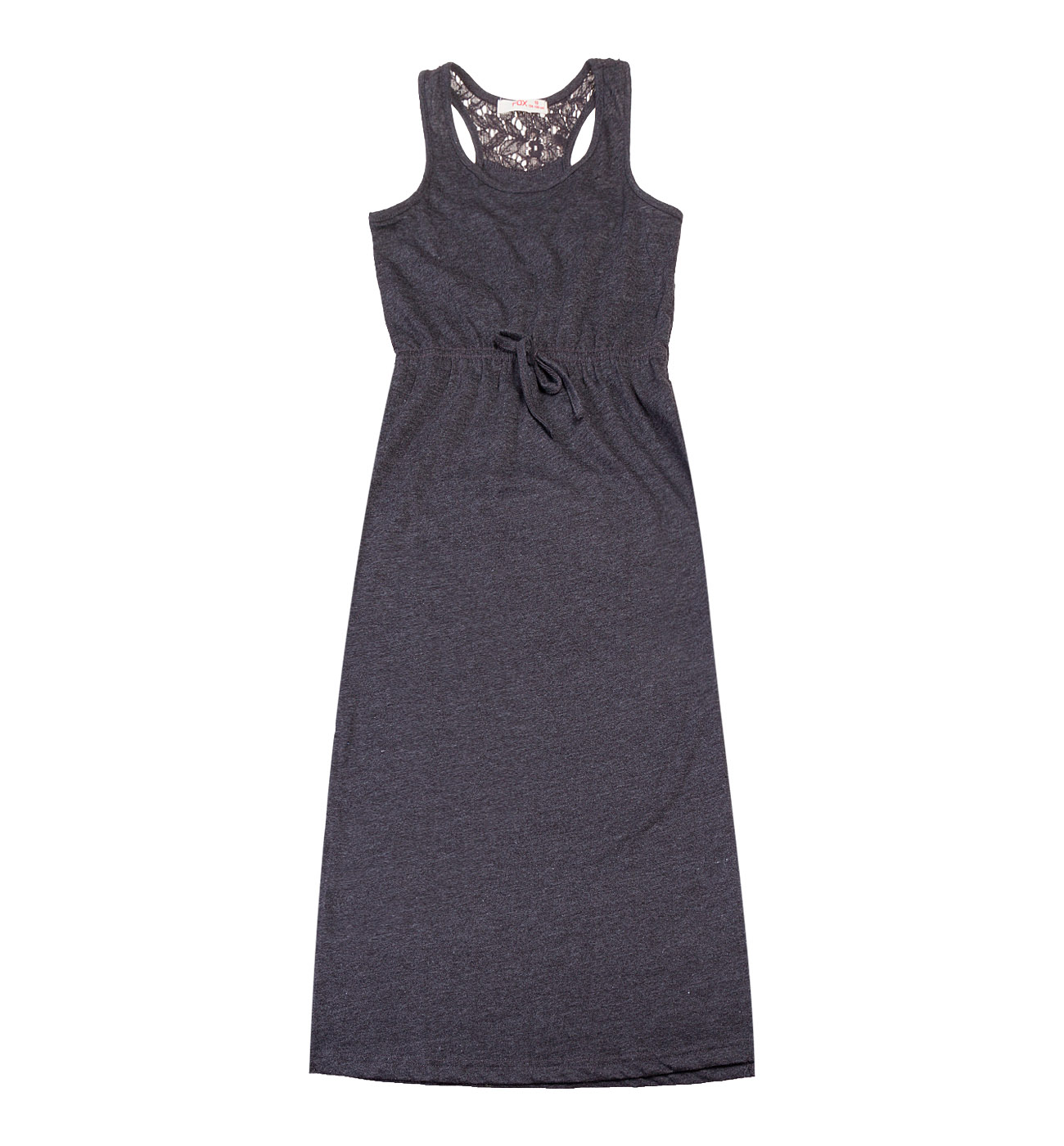 Платье для девочек. Модель выполнена из трикотажного полотна (кулирка). Детали: длина-макси; тонкие лямки; круглый вырез; на спине декор кружевом; пояс на резинке; по бокам разрезы; струящийся силуэт; на поясе декоративный бантик.