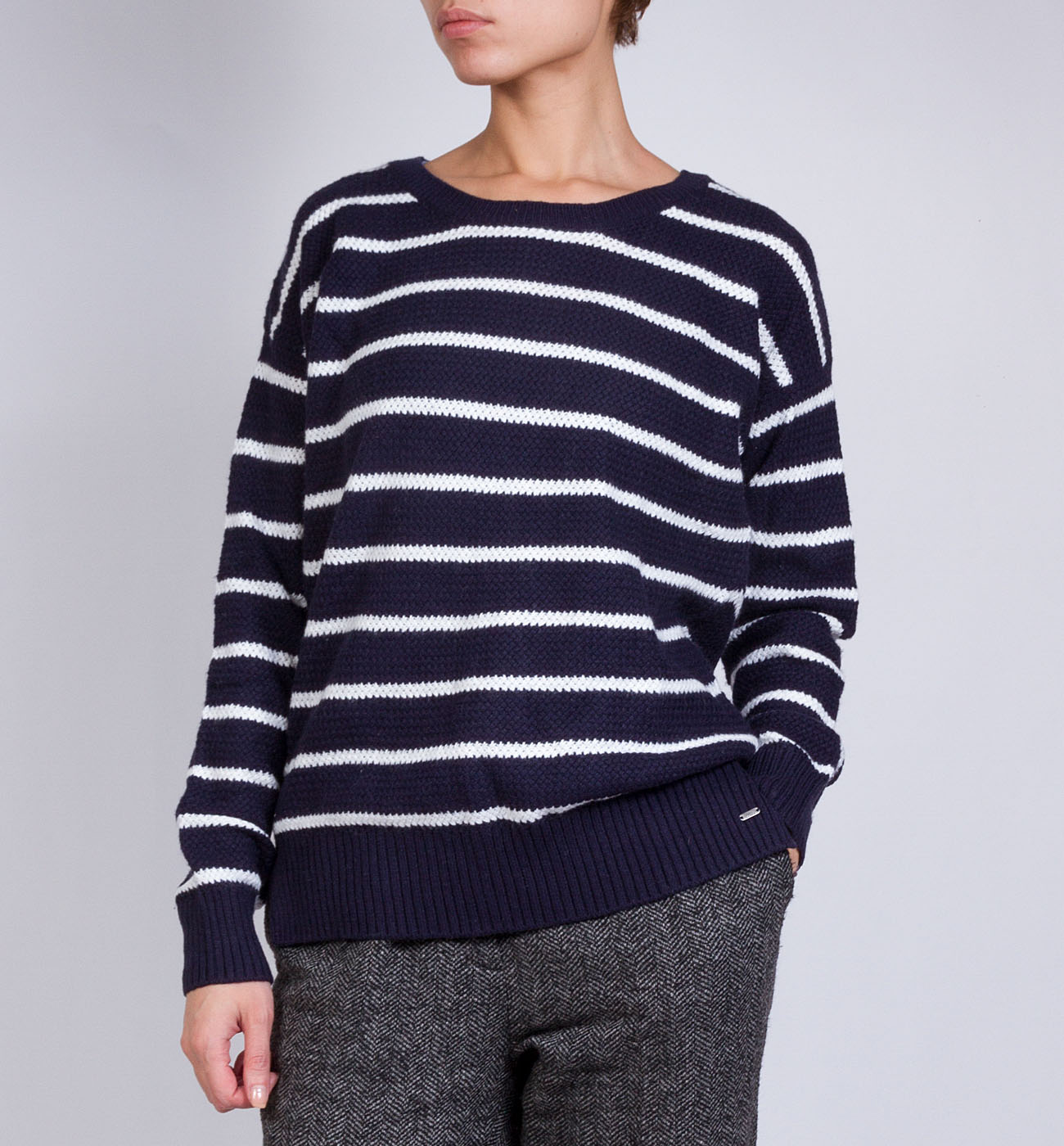 Джемпер женский. Модель выполнена из вязаного трикотажа (фактурная вязка). Детали: круглый вырез; длинный рукав; свободный силуэт; манжеты, ворот и низ связаны резинкой.