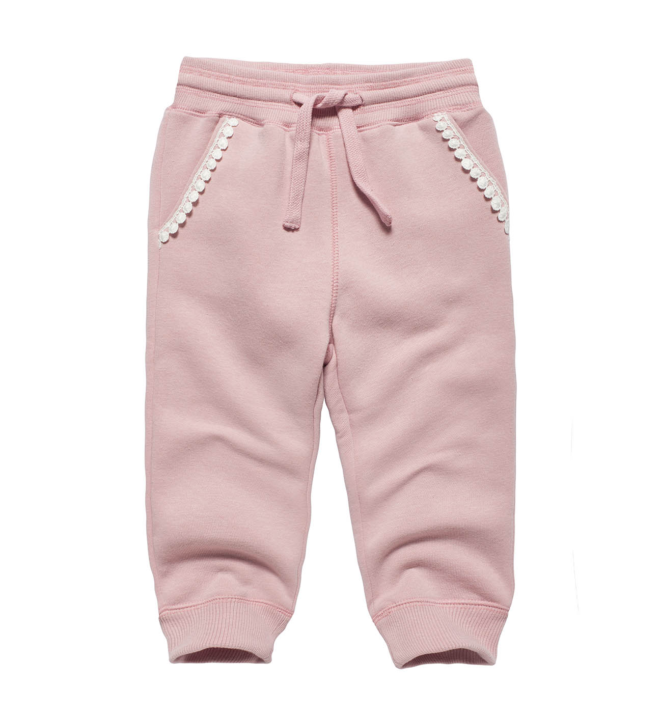 Брюки для девочек. Модель выполнена из футера с начесом. Детали: пояс на резинке и кулиске со шнурком; два кармана; манжеты на трикотажной резинке; на карманах декор кружевом.