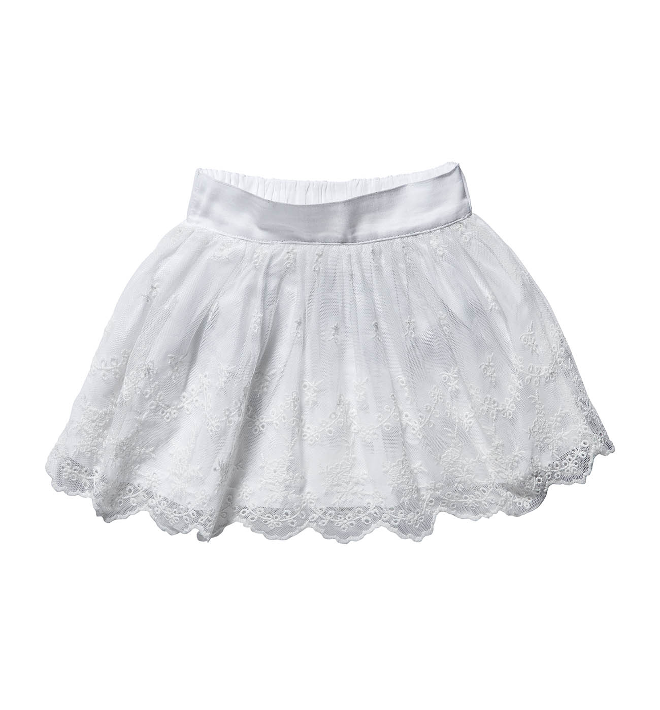 Юбка для девочек. Модель выполнена из кружевной ткани на подкладке. Детали: пояс на резинке.