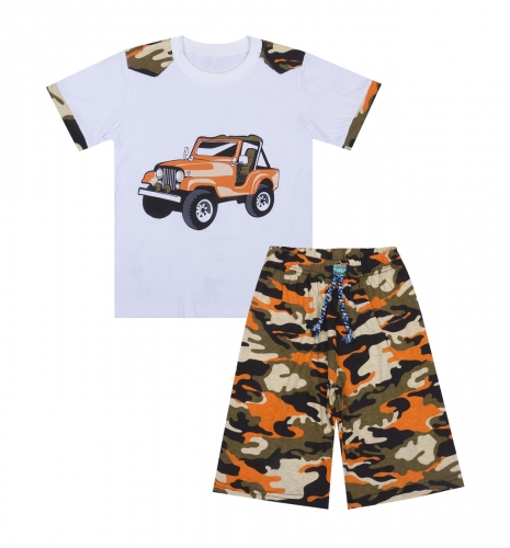 Комплект для мальчиков. Модель выполнена из трикотажа (кулирка). Футболка с коротким рукавом. Детали: круглый вырез; принт; декоративная отделка на плечах и рукавах контрастного цвета. Брюки с поясом на резинке. Детали: принт; декоративная кулиска.